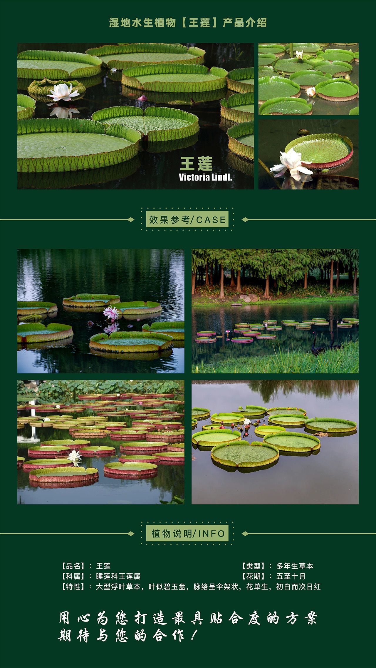 多年生大型浮叶草本,片植,喜高温高湿,生产温度为20~35℃,低于20℃时停止生长,适用于湖泊、池塘造景